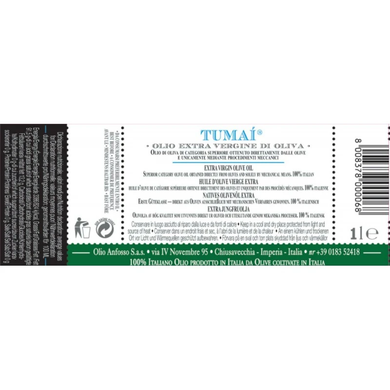 The Extra virgin olive oil 100% Italiano TUMAI by Anfosso is obtained from healthy and ripe olives Italian by mechanical process in a continuous cycle with cold working.