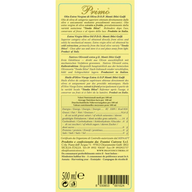 The Extra Virgin Olive Oil Primo PDO Monti Iblei from Cutrera is a monocultivar oil from Tonda Iblea, product of the company ‘Cutrera’ that has reached 150 awards in 13 years. In 2010 it has obtained the precious award as the best extra virgin in the guide Flos Olei, and it’ exported in 30 countries.