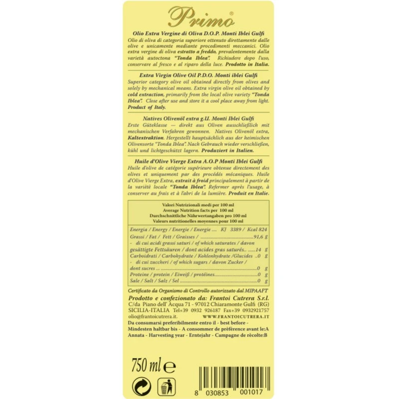 The Extra Virgin Olive Oil Primo PDO Monti Iblei from Cutrera is a monocultivar oil from Tonda Iblea, product of the company ‘Cutrera’ that has reached 150 awards in 13 years. In 2010 it has obtained the precious award as the best extra virgin in the guide Flos Olei, and it’ exported in 30 countries.