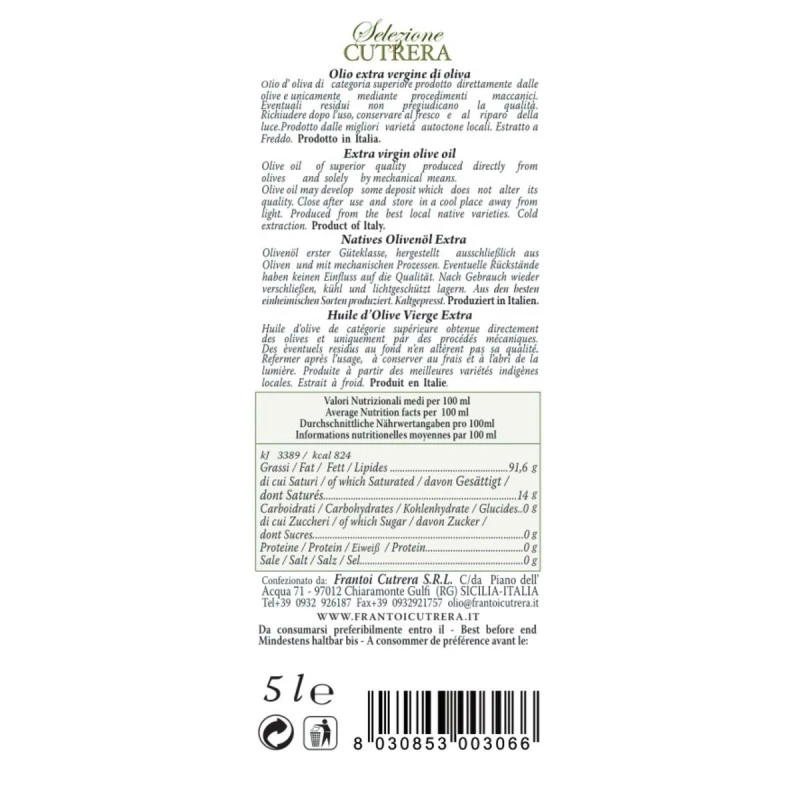 The Extra virgin olive oil Selezione Cutrera Can 5l is an extra virgin olive oil with a bitterness and a spicy very balanced.