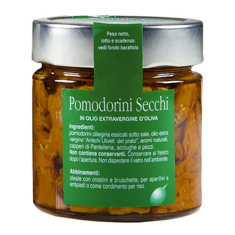 The Dried cherry tomatoes in pitted extra virgin olive oil produced by Fratelli Pinna contain dried cherry tomatoes and Bosana pitted extra virgin olive oil.