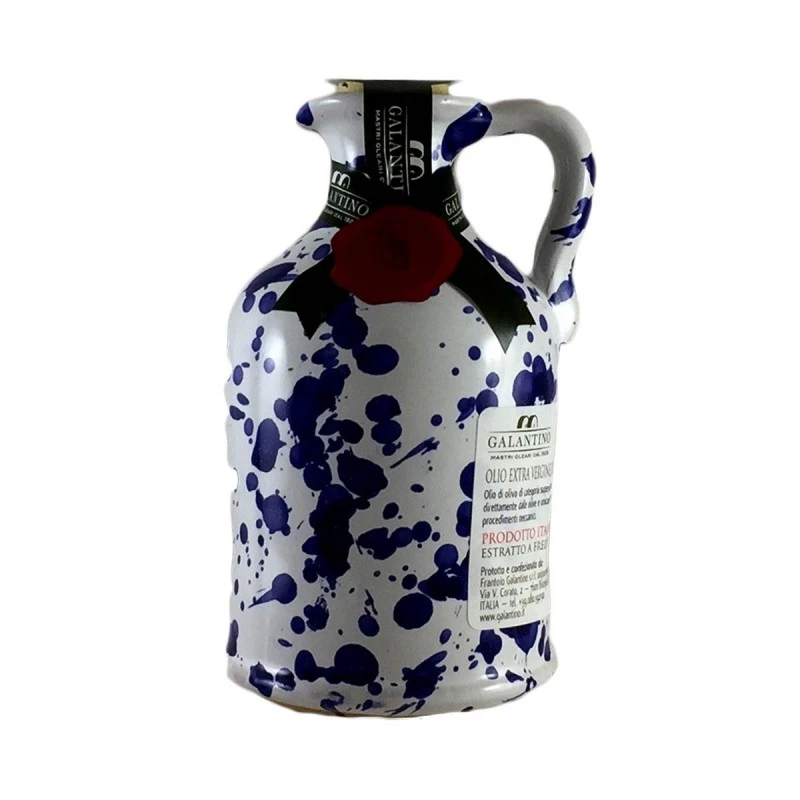 The Extra Virgin Olive Oil Blue Ceramic Jar 100ml is cold extracted from selected olives of the typical varieties of Apulia Coratina and Ogliarola. An ideal oil for everyday use, both raw and cooked. Galantino ceramic jars are hand-made by expert artisans in Puglia. Each piece is unique because it is decorated by hand.