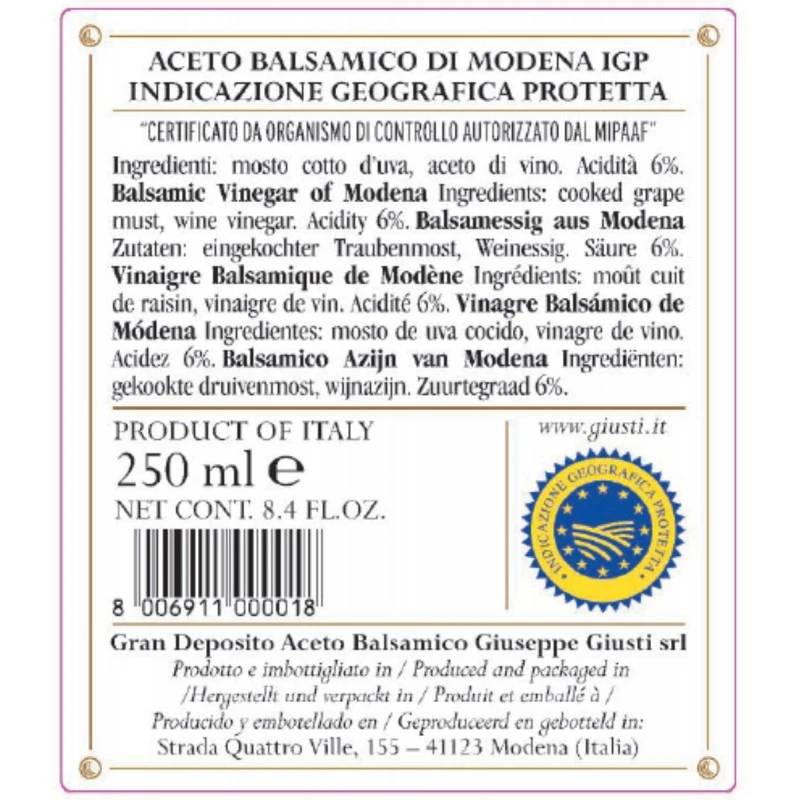 A classic for the Giusti family, the Balsamic Vinegar of Modena IGP 2 Gold Medal Giusti is a greatly versatile balsamic, used fresh or heated. Of a good density and optimal balance between the sweet and sour, it is characterized by overtones of mature fruits, licorice and black pepper.