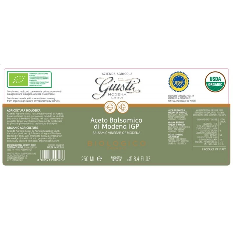 GiustiOrganic Balsamic Vinegar Of Modena PGI 2 Gold Medals 250ml
