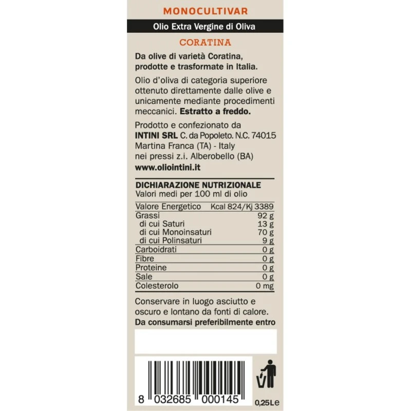 The Extra Virgin Olive Oil Coratina Intini is an extra virgin monocultivar produced from 100% Coratina variety olives. Cultivars Queen of Apulia, is picked up by hand in November, at the right stage of ripening. The result is an oil with an intense fruity, with green and vegetal scents. It’s persistent on the palate but always in perfect harmony as all the extra virgin olive oils of Intini.