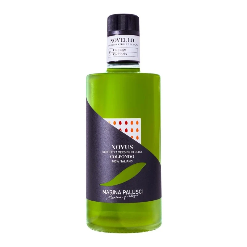 The Extra Virgin Olive Oil Novus by Marina Palusci is an oil obtained from the milling of excellent olives of the Dritta and Leccino cultivars; it follows an immediate bottling in the state of “Mosto” without any decantation. This oil is classified as Novello: the olives are mixed before milling which takes place all together, generating unique and non-reproducible aromas and thus giving the oil a very particular harmony. It is extracted and bottled immediately.