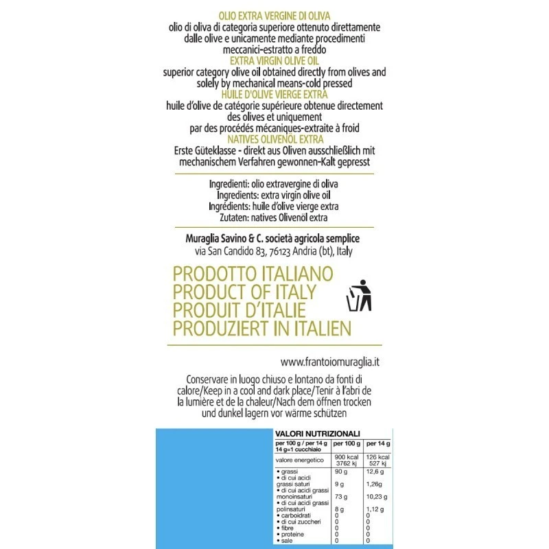 The Extra Virgin Olive Oil Intense Fruity Bag in Box Muraglia is a single cultivar obtained from olive varieties Coratina, and exclusively by the trees of the company. The squeezing occurs within 24 hours of collection. The product is bottled in Essenza bottle.