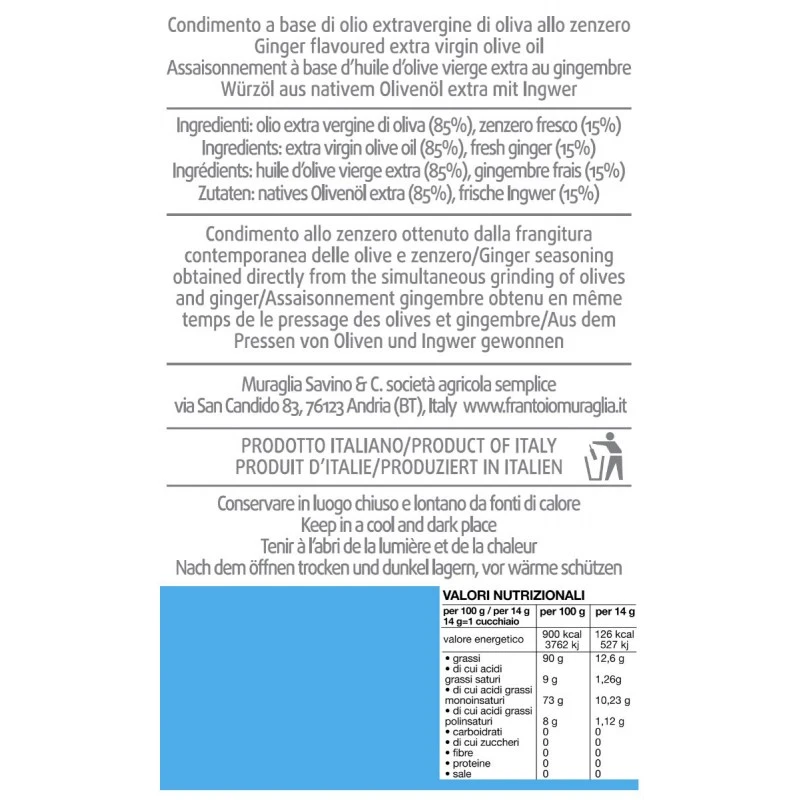 The Ginger flavoured Extra Virgin Olive Oil Muraglia is produced with ingredients revered and celebrated. Frantoio Muraglia has decided to combine the purity of its extra virgin olive oil, a highly selected and sought after raw material produced from the excellence of the lands to create, in effect, a capsule collection of taste, faithful as ever to its DNA. A combination that imparts flavour and achieves its signature style through “fusion”, not only in taste but also in the production process.