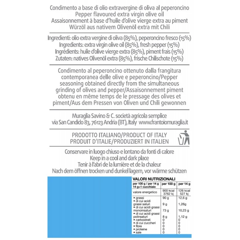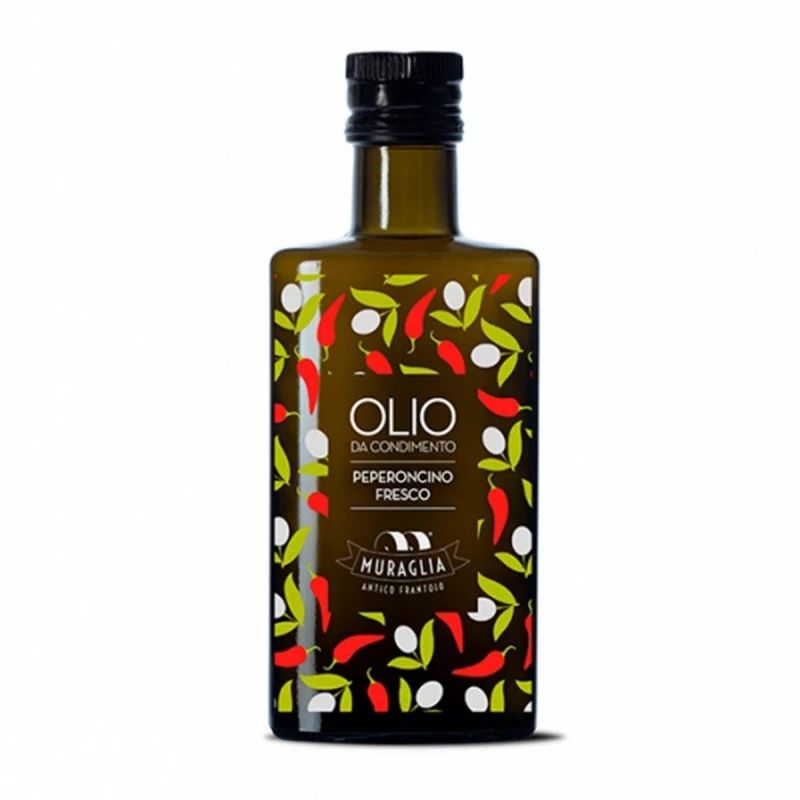 The Pepper flavoured Extra Virgin Olive Oil Muraglia is produced with Pepper from Calabria. Frantoio Muraglia has decided to combine the purity of its extra virgin olive oil, a highly selected and sought after raw material produced from the excellence of the lands to create, in effect, a capsule collection of taste, faithful as ever to its DNA. A combination that imparts flavour and achieves its signature style through “fusion”, not only in taste but also in the production process.