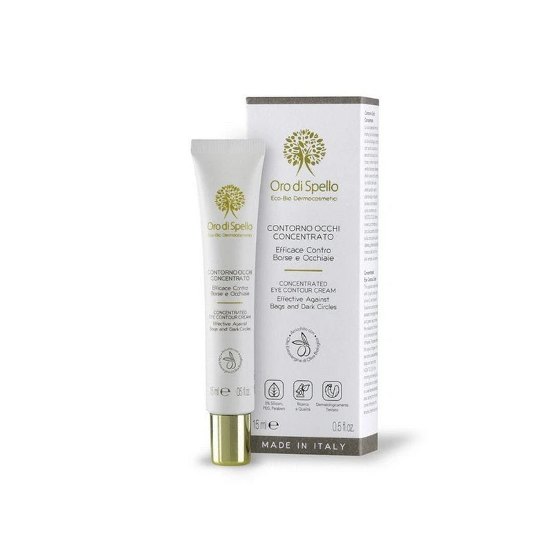 The Concentrated Eye Contour Cream of Oro di Spello is a very effective cream against bags and dark circles. Its special formula with organic extra virgin olive oil is enriched with hyaluronic acid and organic extracts of red vine, mallow and green tea leaves. Promotes the relaxation of fine lines and stimulates the vitality of the skin, reducing signs of fatigue and reducing bags and dark circles around the eye area.