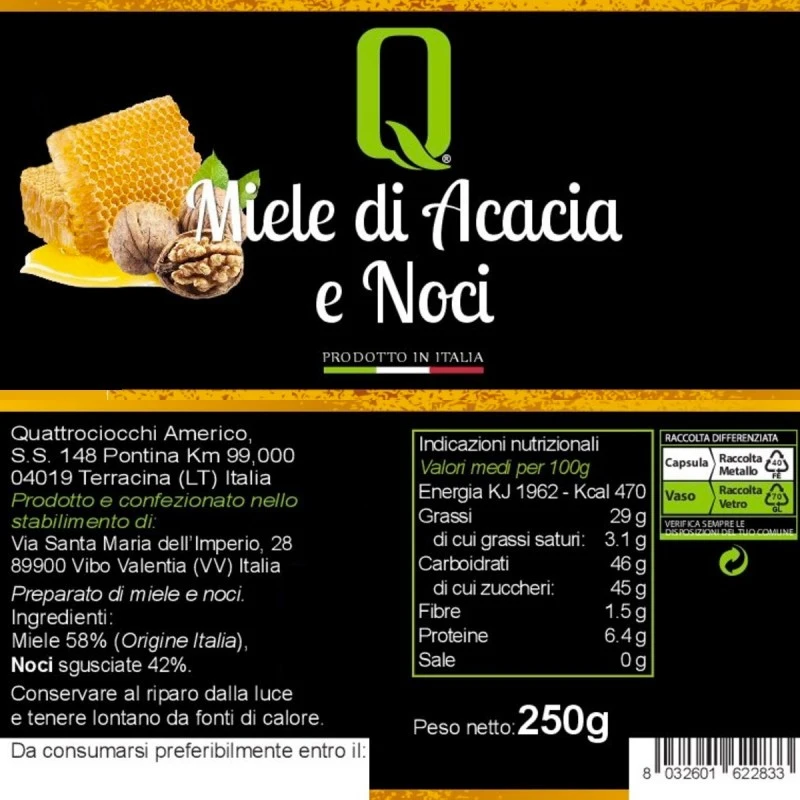 The Acacia Honey and Nuts Quattrociocchi is obtained as a combination of exquisite acacia honey and walnuts: two foods that if taken individually bring numerous benefits to our body, but when consumed together give an even more incredible result. It adapts to any combination with fruit or sweet dishes.