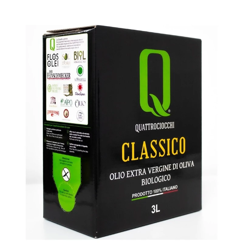 The Extra Virgin Olive Oil Classico Organic Bag in Box 3lt Quattrociocchi is produced from carefully selected organic olives Itrana, Moraiolo and Leccino, cultivated in the organic farm of Quattrociocchi in Alatri. The olive groves are located on Ernici, they are all exposed to the sun and caressed by the breeze foothills. The hand-picked olives are milled daily in the Quattrociocchi’s mill.