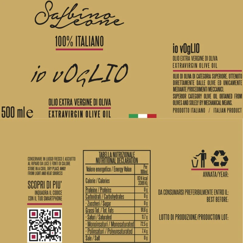 The Extra Virgin Olive Oil Io vOgLIO Sabino Leone is a blend that meets the needs of various consumers, bright and suggestive. It is the product that everyone would like, a tailor-made product that potentially “is good for everyone”.