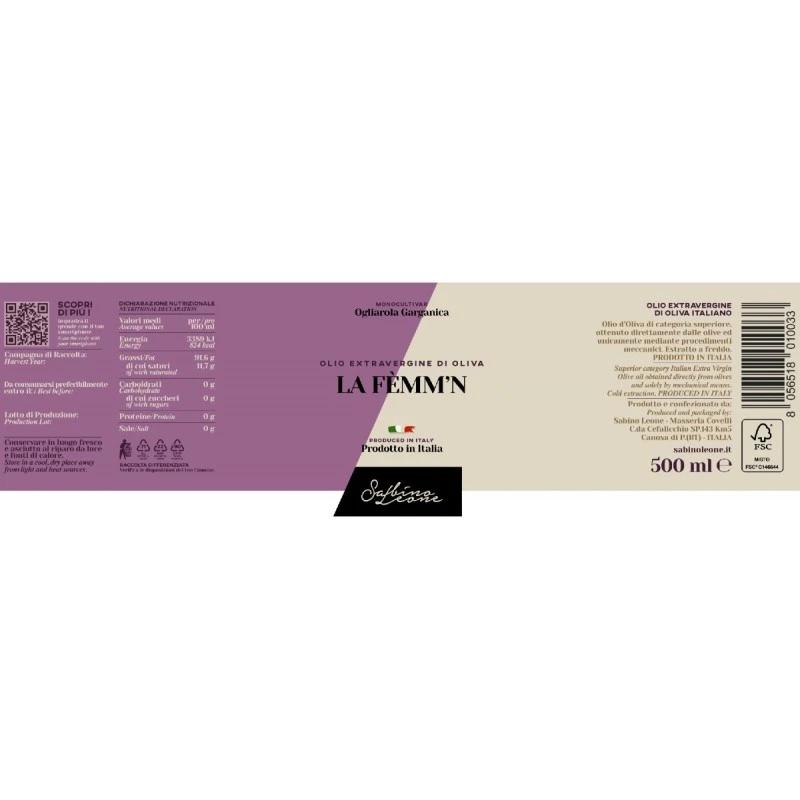 The Extra Virgin Olive Oil La Femm’n by Sabino Leoneis a monocultivar from Ogliarola Garganica, a centuries-old autochthonous Apulian cultivar. Produced from 450-year-old olive trees, with irregular sixth and with few plants per hectare. Fascinating and complex plants, to take your breath away; for this reason it is called “La Femm’n”: the woman. it’s a clean and balanced monocultivar, very delicate, medium fruity fragrant with a sweet taste with hints of aromatic herbs.