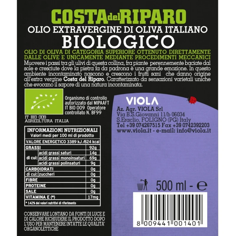 The Extra Virgin Olive Oil Costa del Riparo Organic by Viola is characterized by unique varietal sensations that evoke the taste of the good. It is the ideal food for a healthy diet. It is produced from olives harvested from plants kissed perennially by the sun and grown where the stone is king, in an uncontaminated environment.